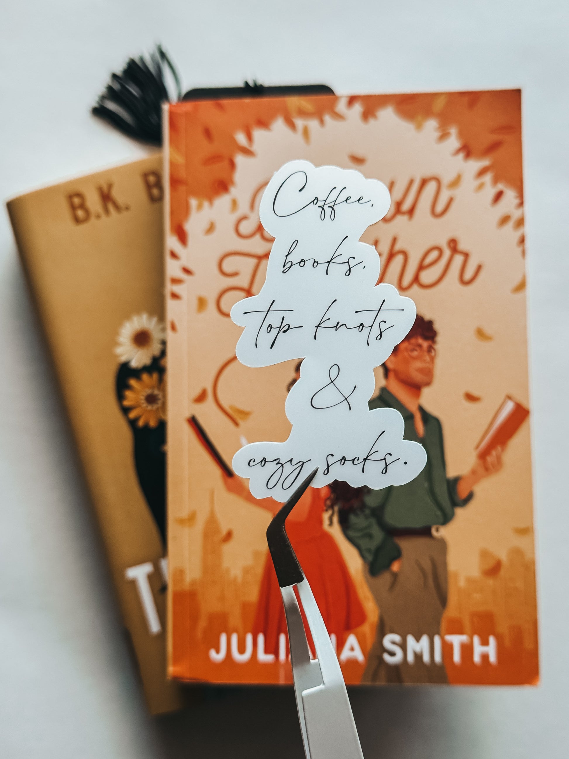 Celebrate the cozy life with this charming die-cut sticker featuring elegant script that reads: “Coffee, books, top knots & cozy socks.” Perfect for book lovers, latte sippers, and anyone who thrives on warm, comfy vibes, this sticker adds a touch of aesthetic charm to laptops, water bottles, journals, and reading carts. Printed on durable, high-quality vinyl, it’s designed to stay beautiful through everyday use—just like your favorite comfort rituals.