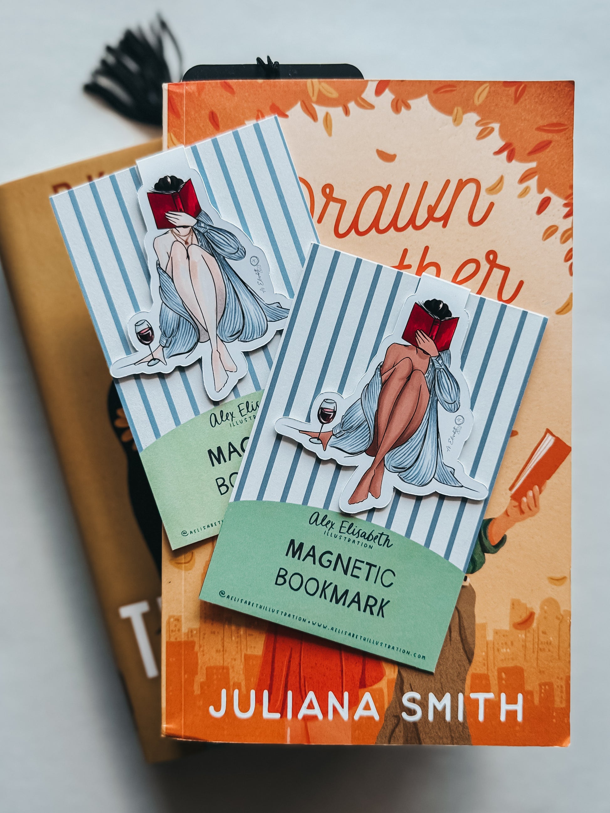 Cozy up with this elegant magnetic bookmark featuring a serene reader wrapped in an oversized button down, lost in a good book with a glass of wine by her side. Designed with strong magnets that securely clip to your pages without slipping, this bookmark is perfect for romance lovers, book club girls, and anyone who appreciates a little self-care with their reading time. Stylish, functional, and the perfect companion for your next binge-read.